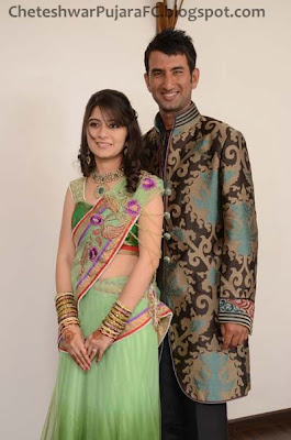 Pujara's wife, puja, wore a cream bridal ghagra with traditional red cheteswar pujara and pooja pabari's wedding reception was held in rajkot on 14 february, 2013.