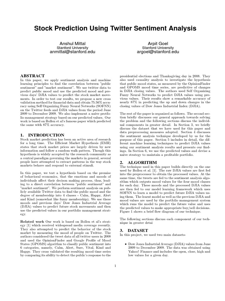 Twitter Stock Market Prediction . Twitter Mood Predicts The Stock Market 5 Assesses General Mood By Checking Whether Messages Contain Certain Words (Opinionfinder And Google Profile Analysis Of Tweets For Prediction Of Indian Stock Markets Phillip Tichaona Sumbureru Department Of Computer Science And Engineering, Jntu.
